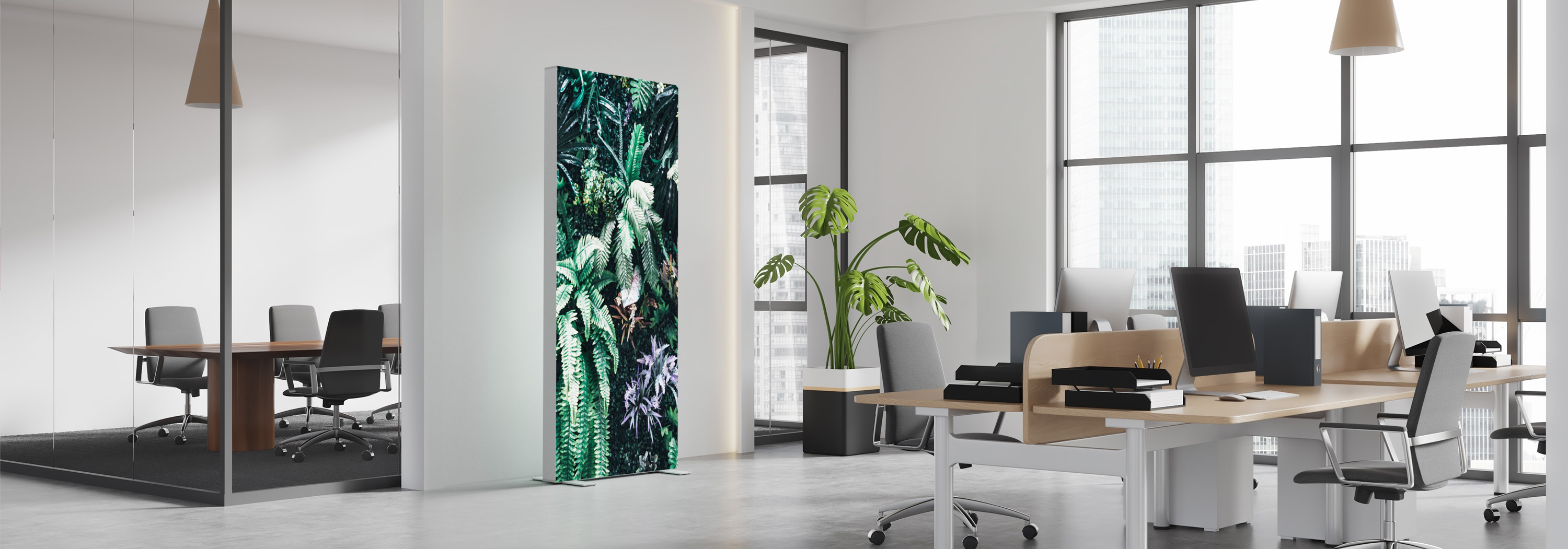 Die BIG LEDUP® stele nutzt präzise gefertigte, silber-eloxierte Aluminiumprofile mit einer Bautiefe von 12 cm. Das sorgt für ein modernes und schlankes Erscheinungsbild, das sich in unterschiedlichste Umgebungen integrieren lässt. Die Profile gleiten passgenau ineinander und bilden einen stabilen Rahmen. Grafikpaneele mit angenähtem Silikonkeder lassen sich sauber, faltenfrei und ohne großen Aufwand einsetzen.