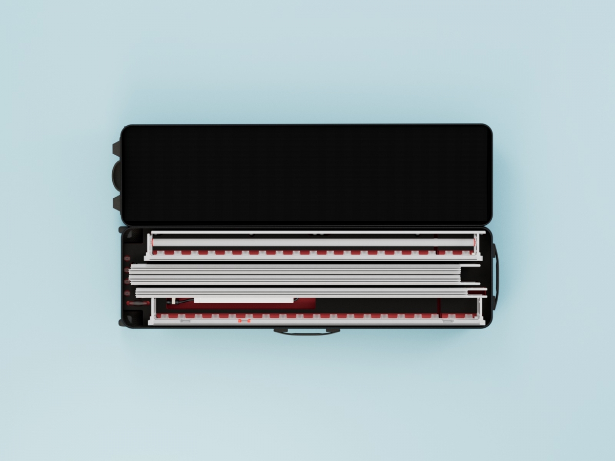 Die präzise gefertigten Aluminiumkomponenten lassen sich stabil und passgenau miteinander verbinden, während das System insgesamt leicht und mobil bleibt. Für den Transport werden alle Elemente sicher im kompakten ABS-Hartschalenkoffer verstaut. So ist die BIG LEDUP® stele jederzeit flexibel einsetzbar – ob auf Messen, Events, im Retail oder im Showroom.