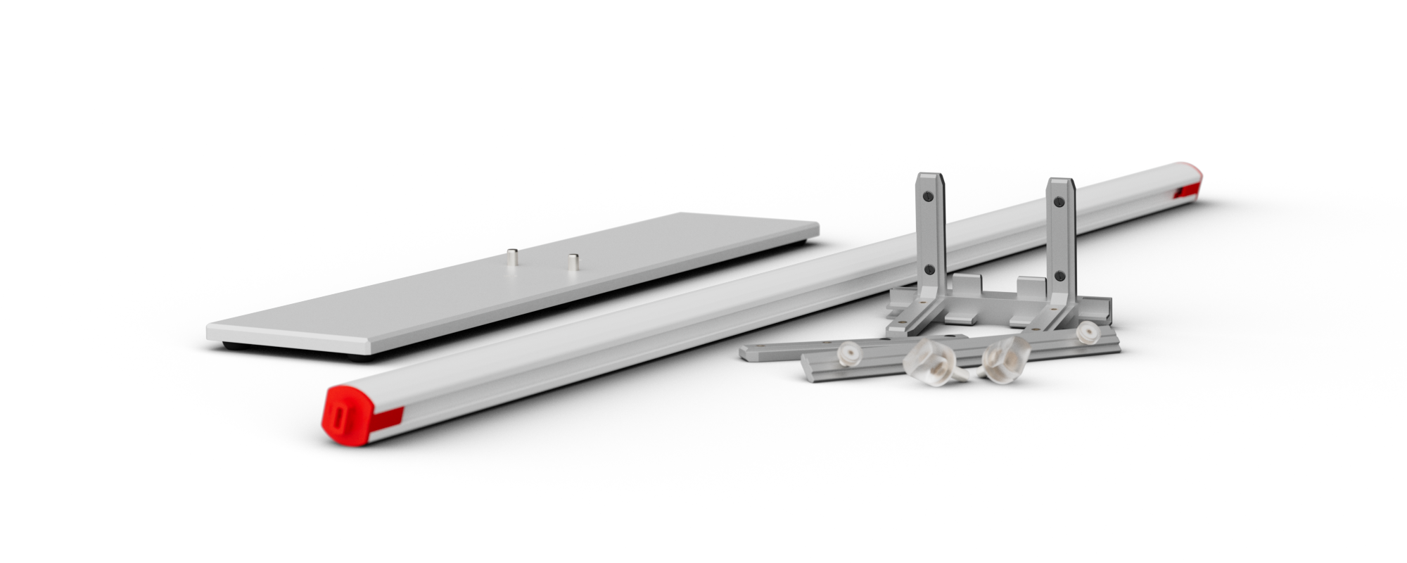 Nehmen Sie die einzelnen Bauteile einfach aus dem praktischen ABS-Koffer, setzen Sie sie zusammen (kein Werkzeug erforderlich), schrauben Sie die Füße an – und schon ist das System einsatzbereit! Digitale Drucke mit angenähten Silikonkedern lassen sich mühelos am System befestigen, sind benutzerfreundlich in der Handhabung und können jederzeit rasch und einfach ausgetauscht werden.
