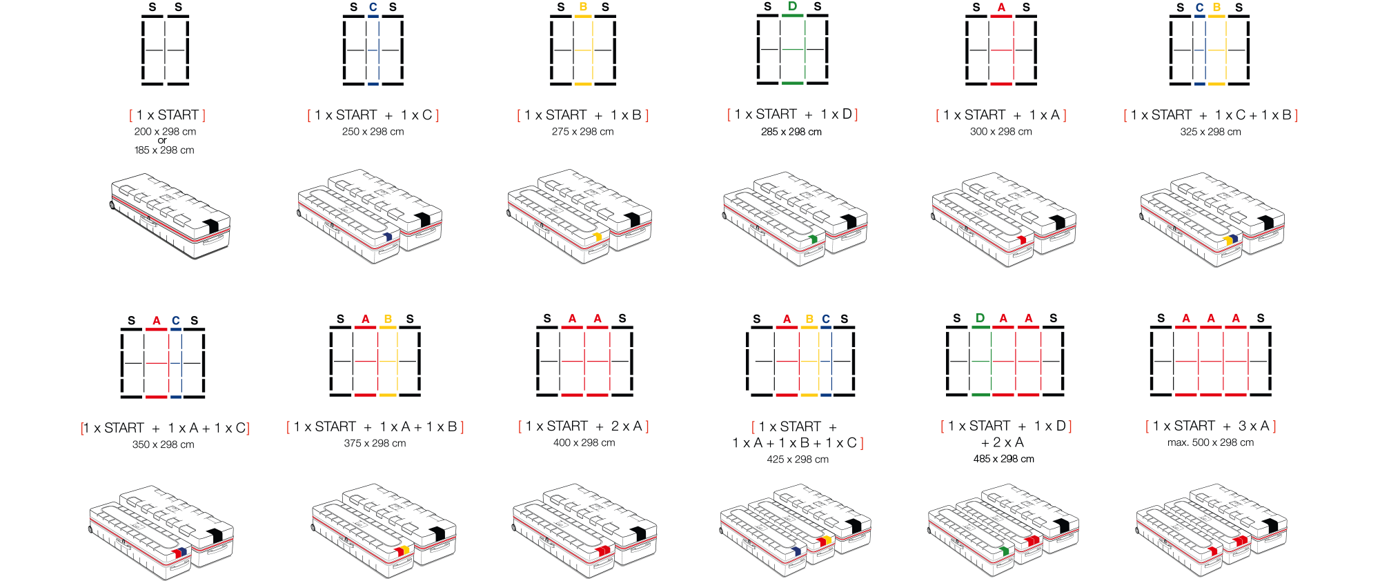 Darüber hinaus stehen verschiedene Höhen von 200, 230, 248 und 298 cm zur Auswahl.