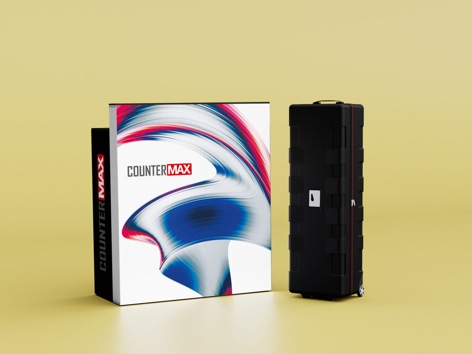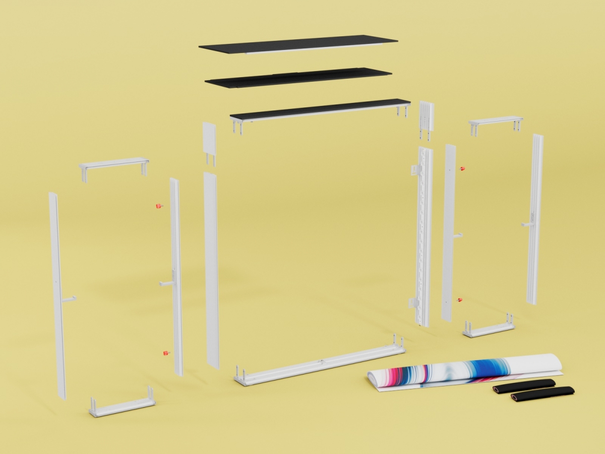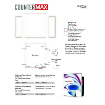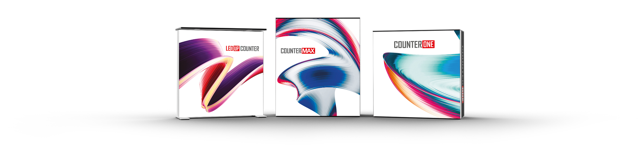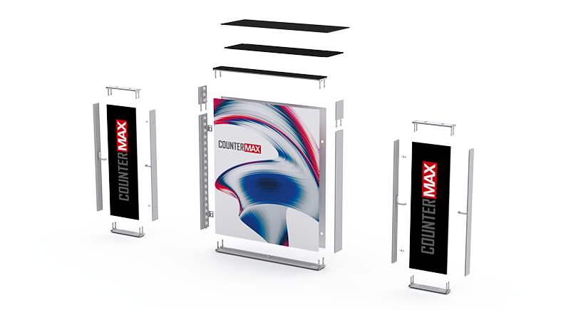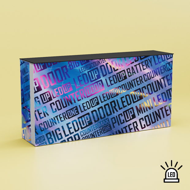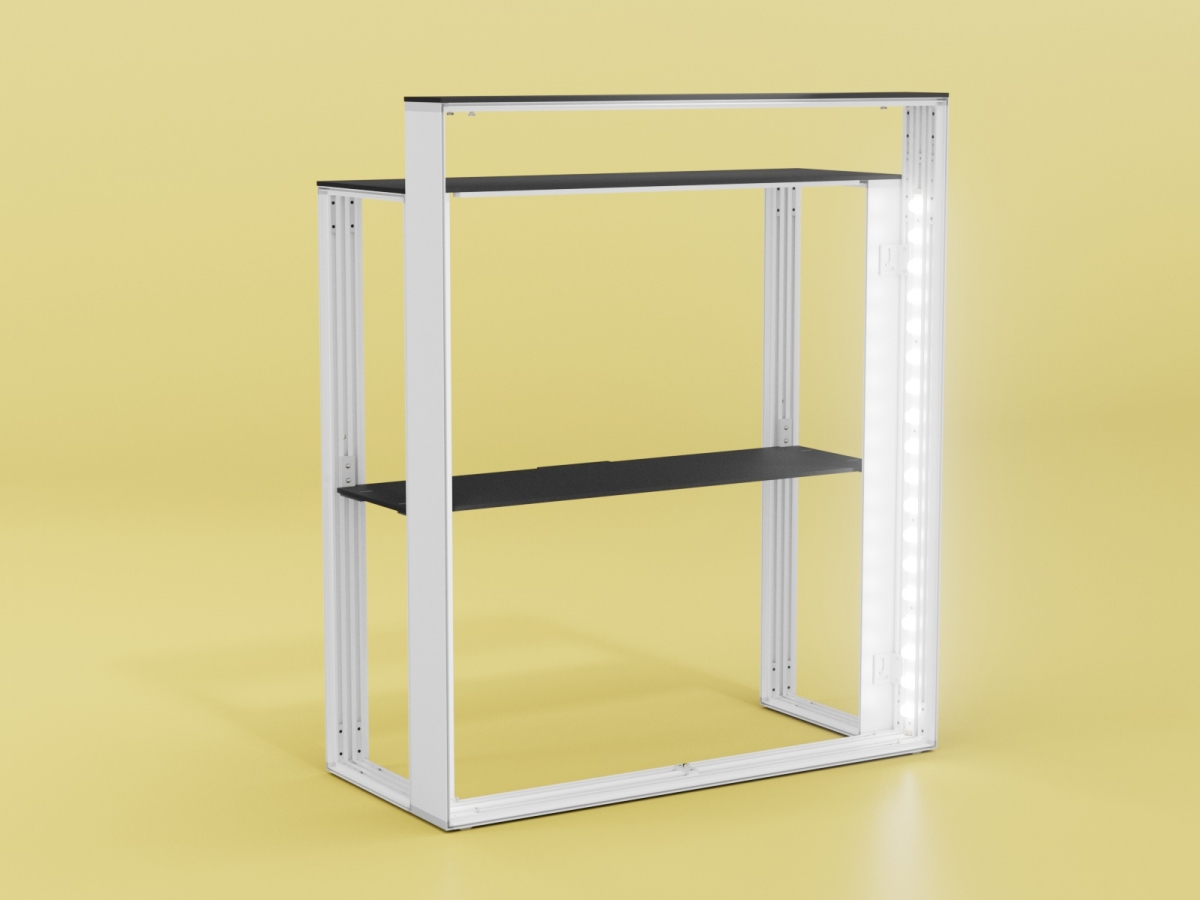 Der COUNTER MAX ist eine mobile Theke mit einer LED-beleuchteten Vorderseite (100 x 116 cm) und einem Ablagefach auf der Rückseite. Der COUNTER MAX hat im Gegensatz zum COUNTER ONE eine erhöhte Vorderwand um eine klarere Abtrennung zu erhalten. Hochwertige Aluminiumkomponente in Kombination mit einer lebendigen und gleichmäßigen Beleuchtung machen diese Einheit unverzichtbar für all Ihre Ausstellungen. Darüber hinaus ist sie dank des robusten ABS-Transportkoffers einfach zu transportieren.