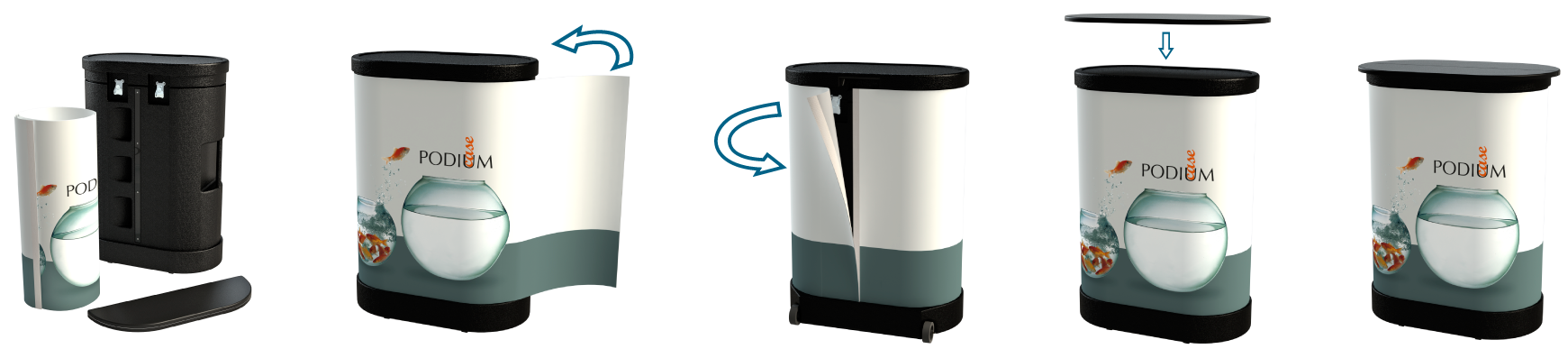 Das umlaufende Grafikpanel wird mit einem Klettverschluss befestigt. Mit der optionalen klappbaren Tischplatte haben Sie eine große Arbeitsfläche von 76x48 cm , um Ihre Produktivität bei der nächsten Veranstaltung oder Messe zu steigern.