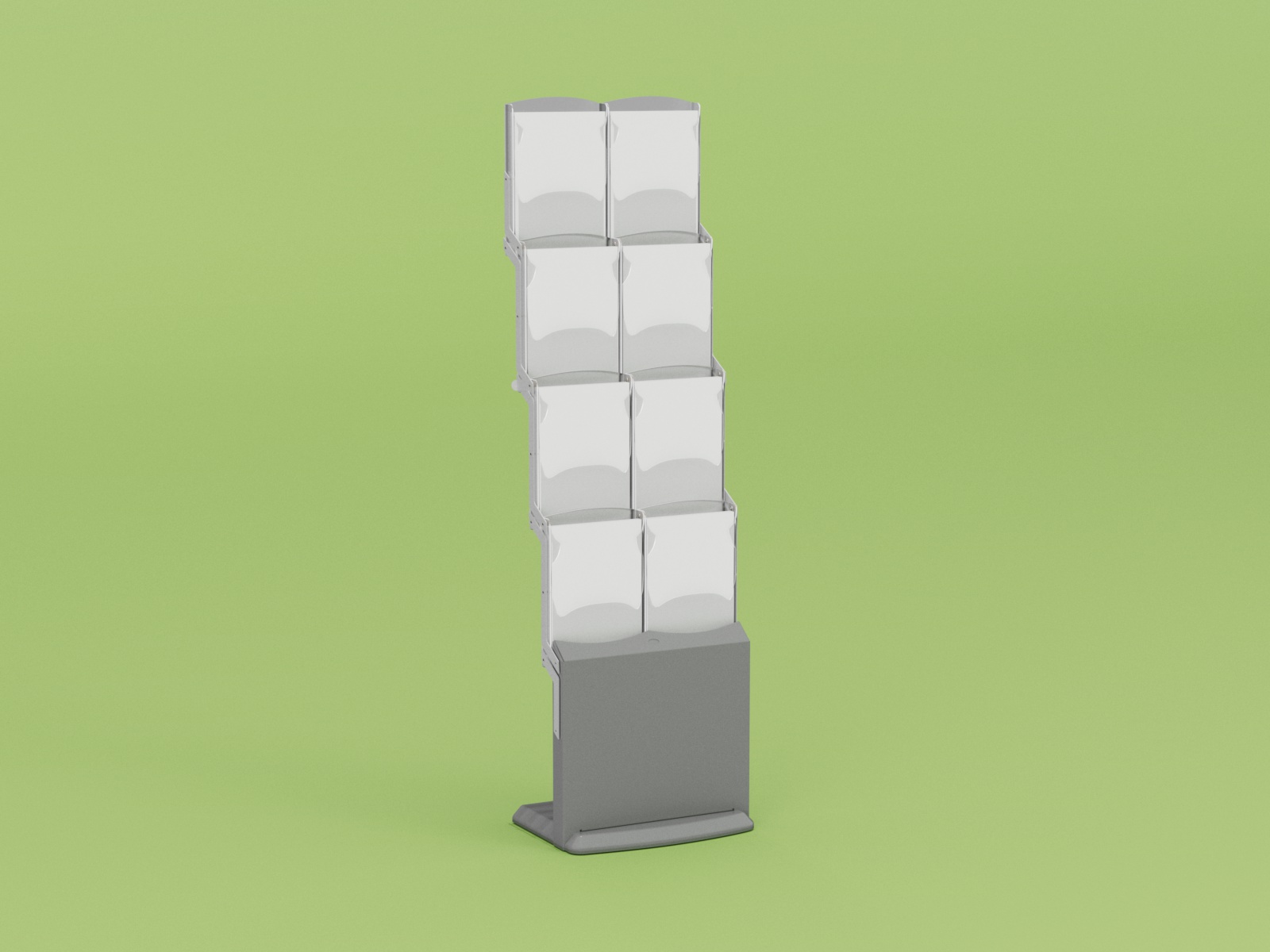 Der Brochure EASY UP BIG ist ein faltbarer Prospektständer für acht A4-Broschüren. Die Seitenteile und die Frontplatte bestehen aus Aluminium, während die Basis aus silber lackiertem Holz gefertigt ist.