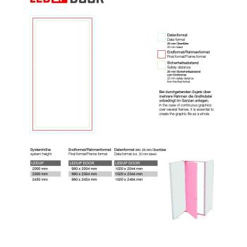 Die unbeleuchtete LEDUP® DOOR ist eine elegante Ergänzung für Ihren Raum. Sie besteht aus silber eloxierten Aluminiumprofilen mit einer Tiefe von 80mm und Aluminium-Gussverbindern. Die LEDUP® DOOR hat eine Einbaubreite von 100cm und ist in drei Einbauhöhen (200, 230 und 245cm) erhätlich. Die Druckformatbreite beträgt 98 cm, und die Druckformathöhe variiert je nach Modell zwischen 200,4 cm, 230,4 cm und 245,4 cm. Mit einem Gewicht von nur ca. 22,8kg ist sie besonders handlich.