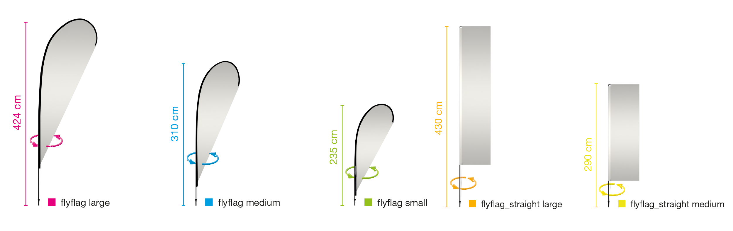 Das mobile Fahnensystem flyflag wird in gerader oder Tropfenform angeboten. Vier verschiedene Fuß- bzw. Befestigungsvarianten sind im Programm - Stellfuß, Metallbodenplatte, Erdspieß und eine Wandhalterung (nicht für alle Größen). Das Gestänge besteht aus ineinander steckbaren Aluminium- und GFK-Stäben.
