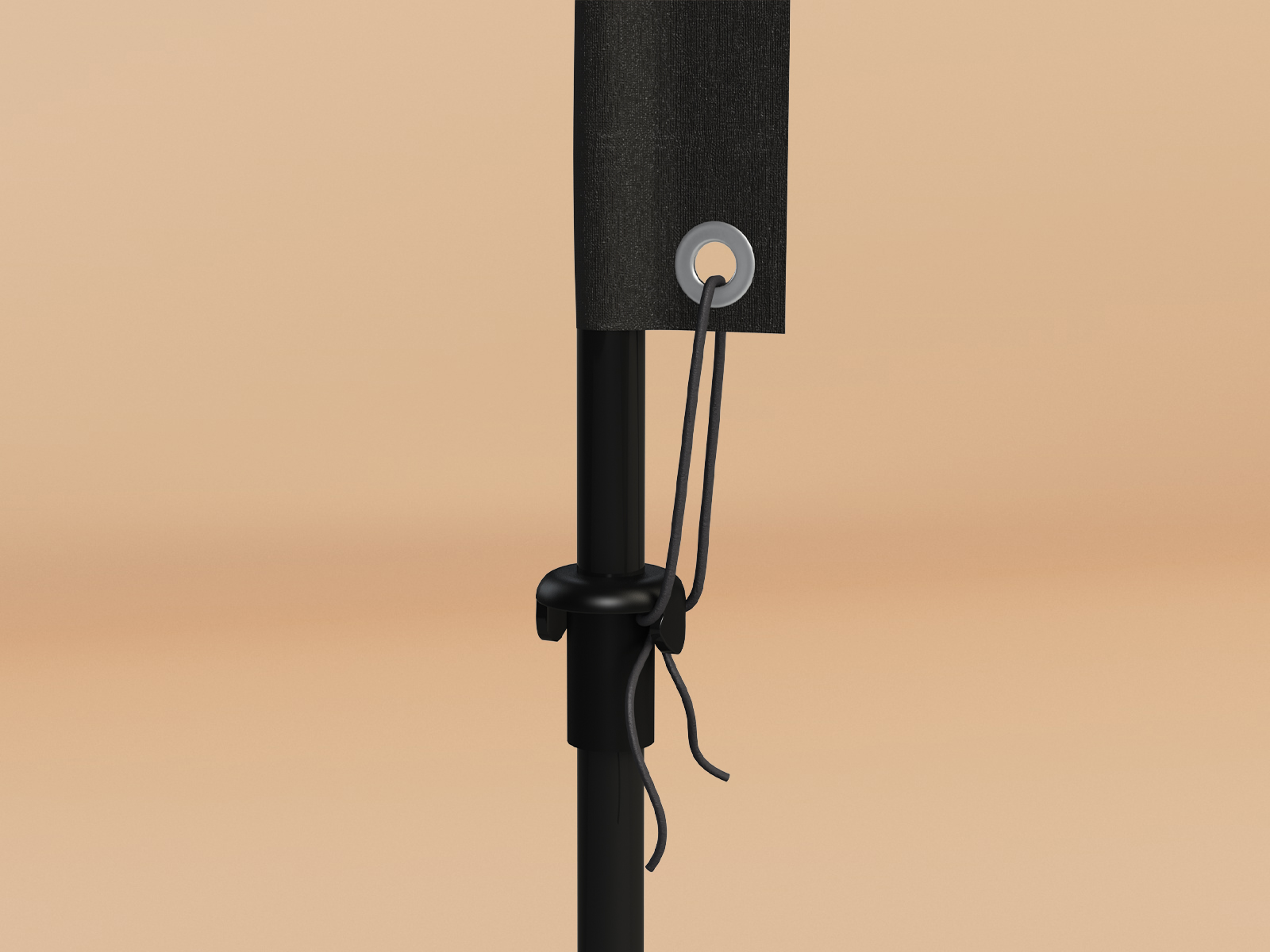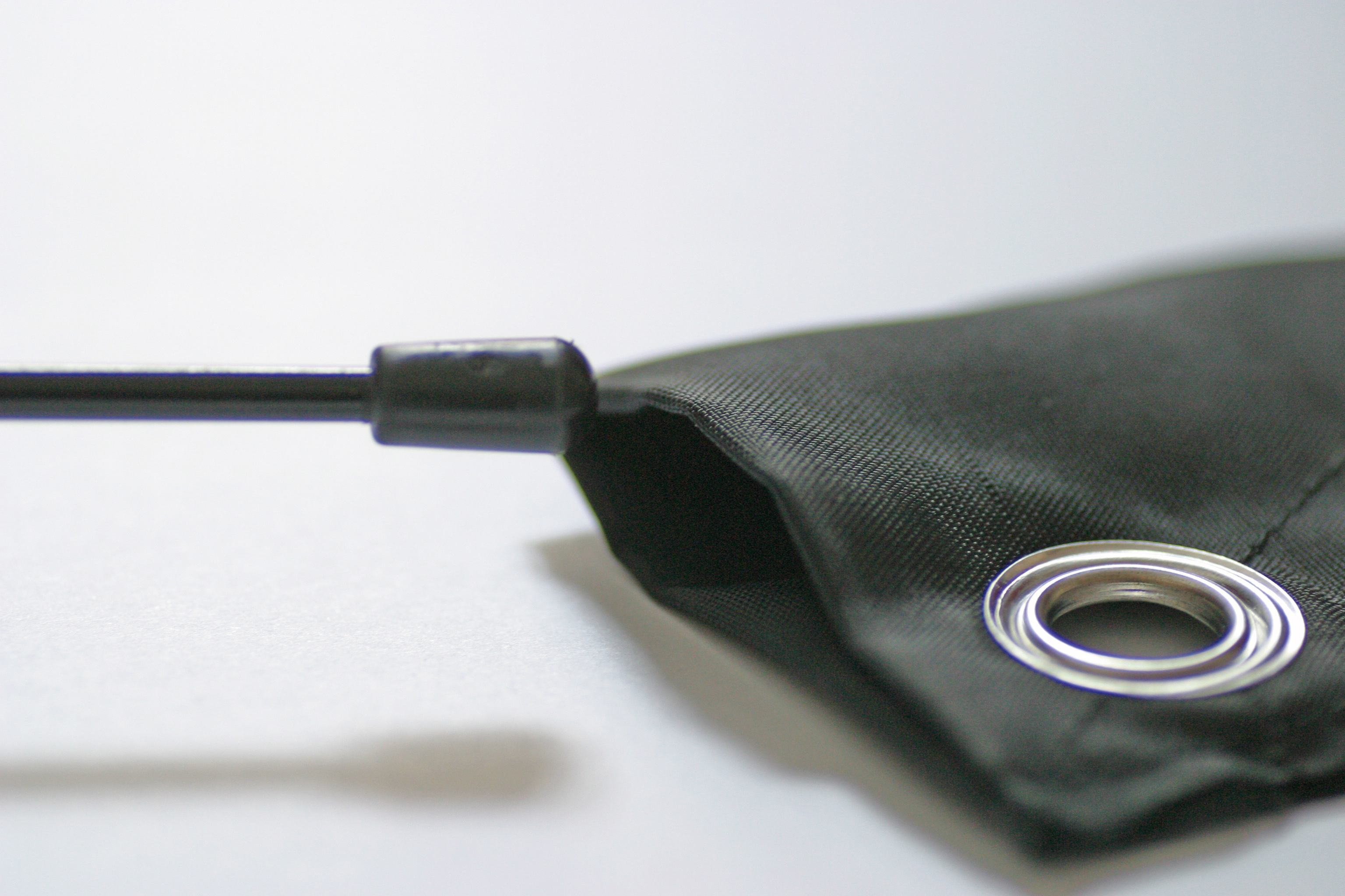 Die bedruckte Fahne wird über das Gestänge gezogen (Führungsband bei flyflag, Hohlsaum bei flyflag_straight) und mit einem Karabiner am Gestänge fixiert.