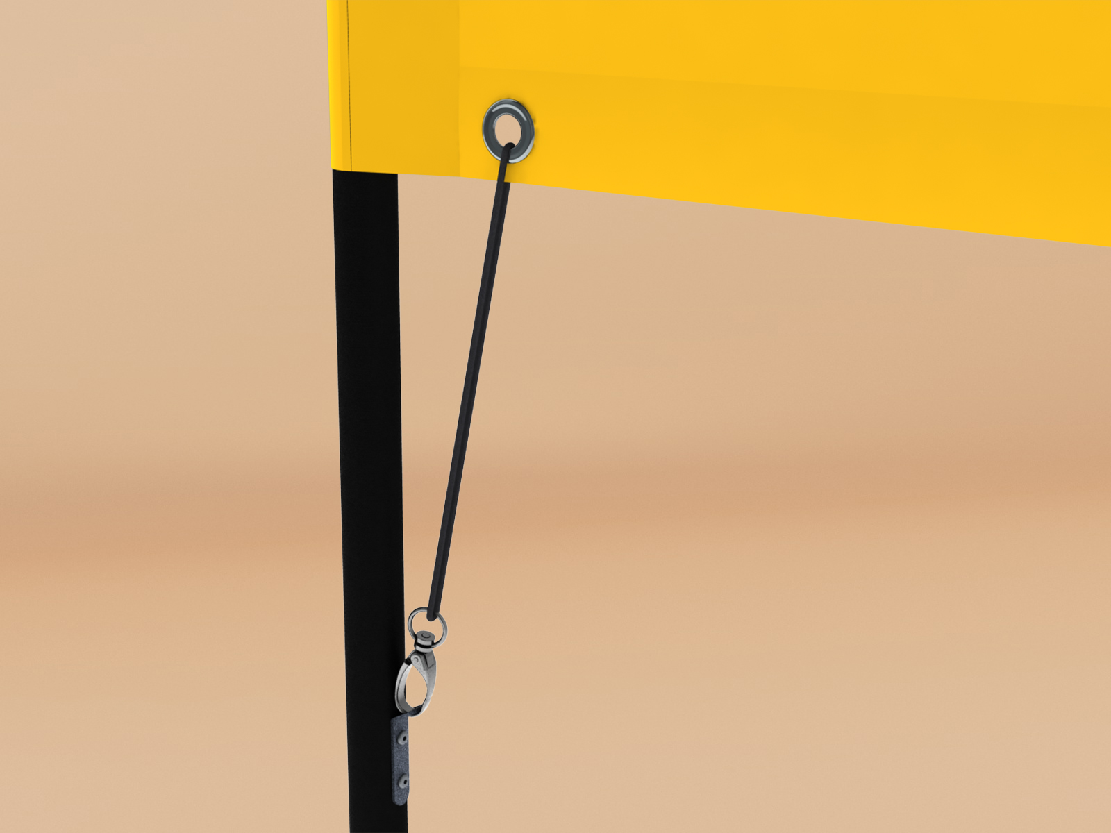 Das Gestänge zusammenstecken und anschließend die Fahne über die Stäbe ziehen. Ein Spanngummi wird durch eine Öse an der Unterseite der Fahne gezogen und mit einem Karabinerhaken am Gestänge fixiert. Dadurch kann die richtige Spannung leicht eingestellt und nachjustiert werden. Das System wird auf den gewünschten Fuß aufgesteckt.