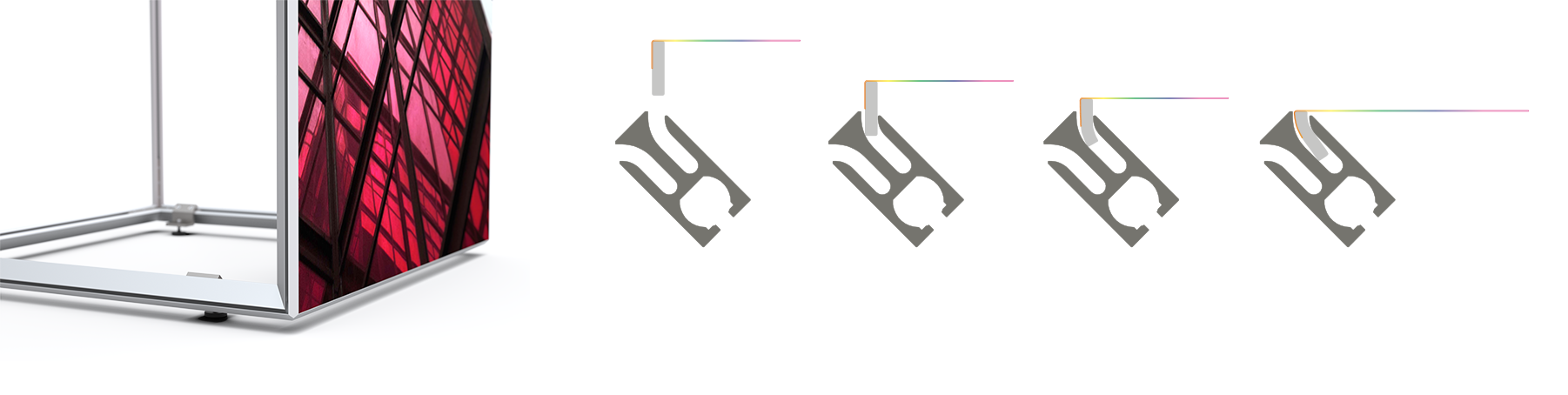 Der Vorteil im Vergleich zu ähnlichen Produkten ist der 90°-Profil-Schlitz. Der Stoff wird 3 mm in den Schlitz gedrückt und erst dann um die Ecke gespannt. Diese Technik trägt dazu bei, den Stoff zu schonen, da sie verhindert, dass er überdehnt wird.